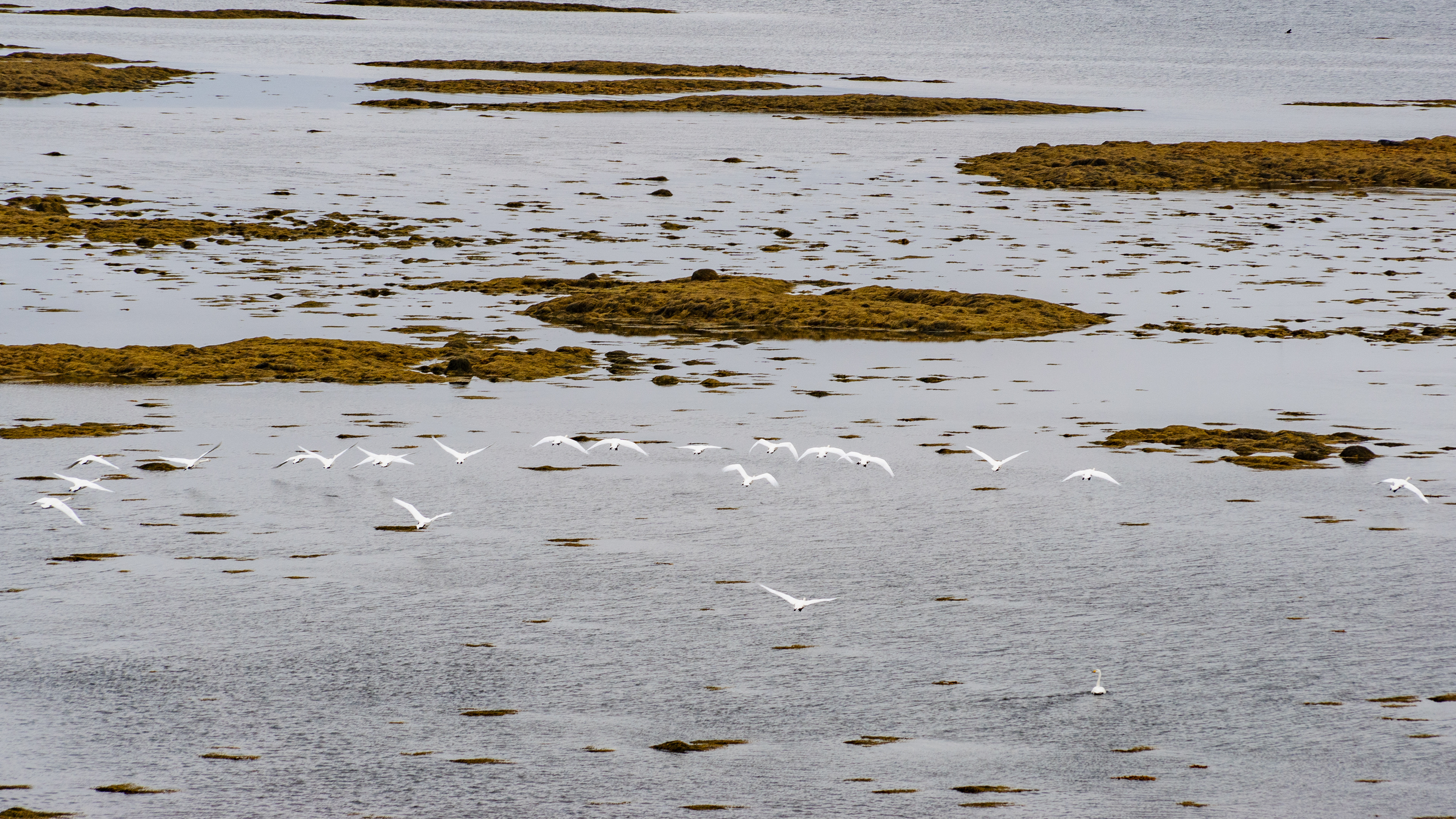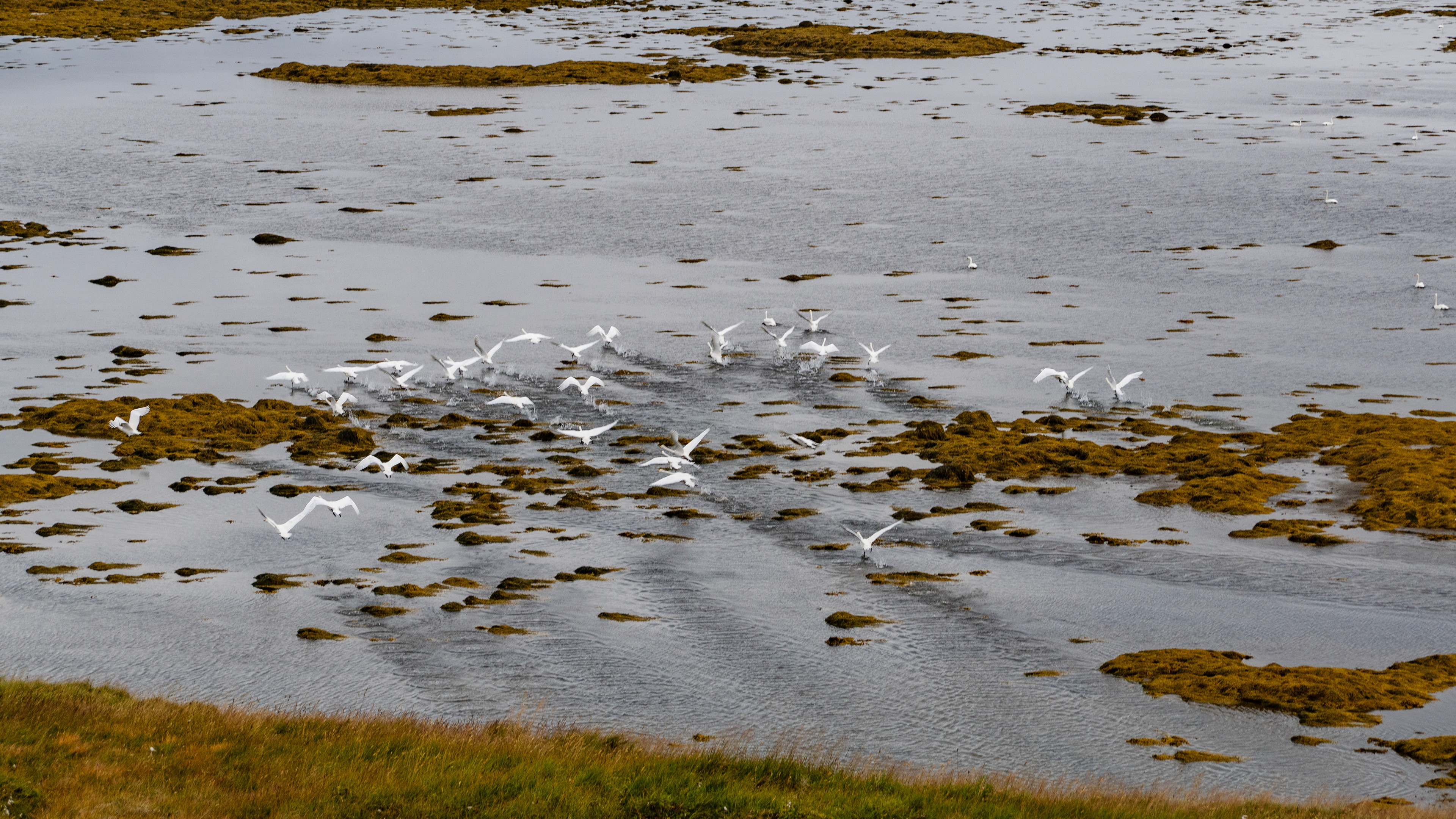 From the cairns further to the banks full of birds. The trumpeting of the swans on the shore was so loud, we could hear it from far away with the window slightly open.