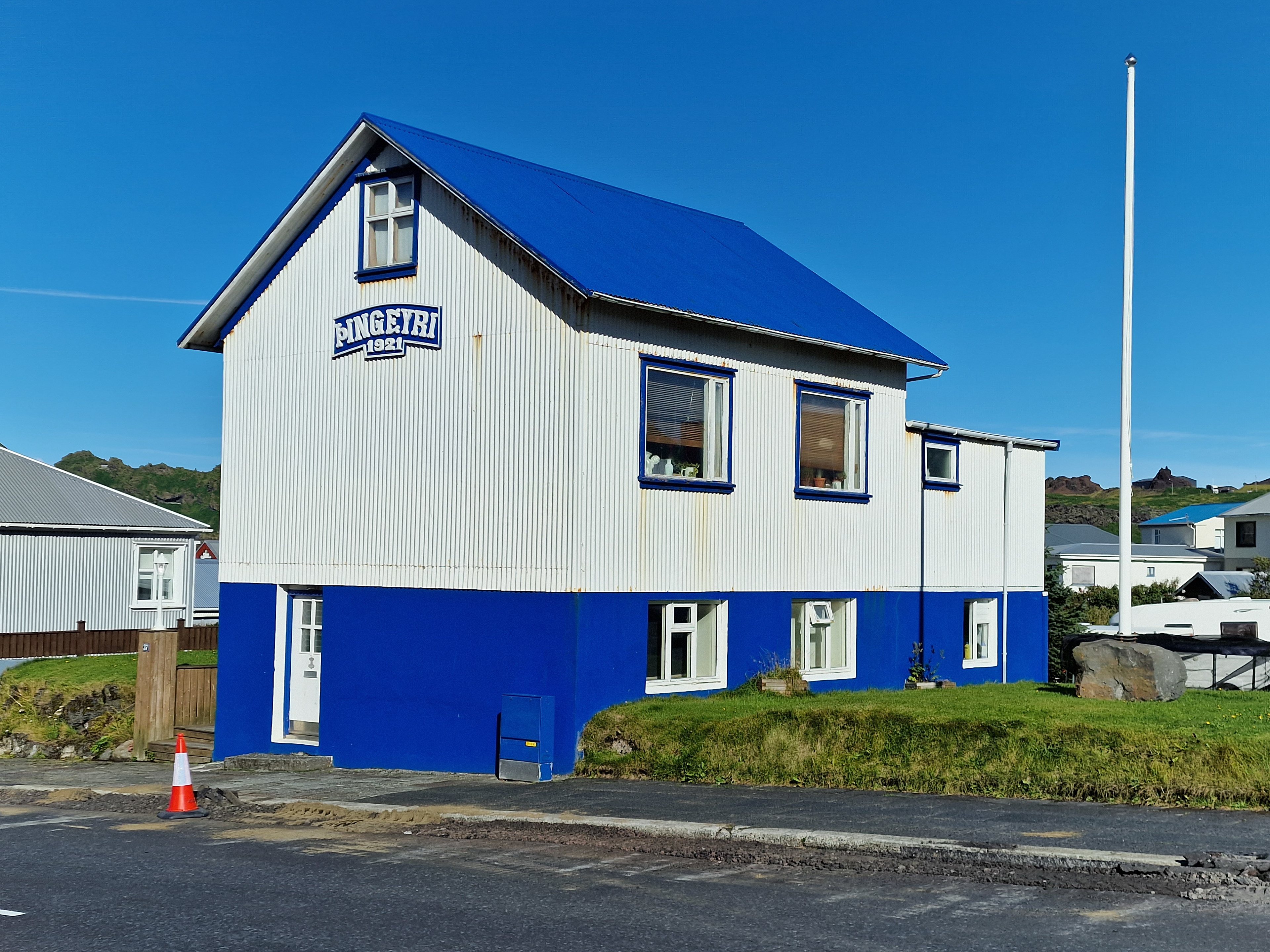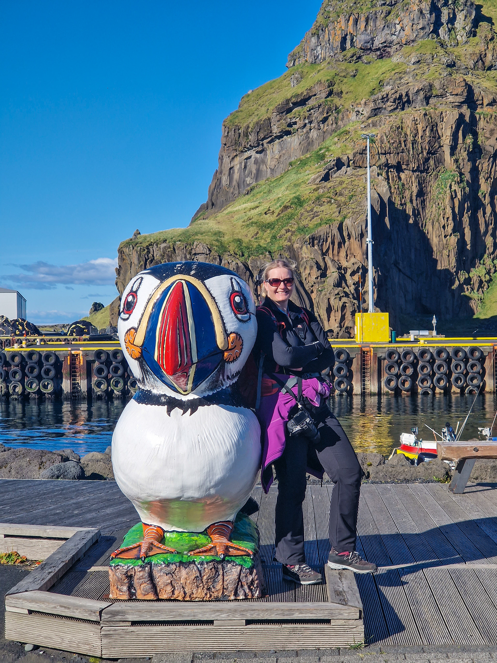 Typical for Icelandic places, the houses painted with bright colors - and the only Puffin far and wide!