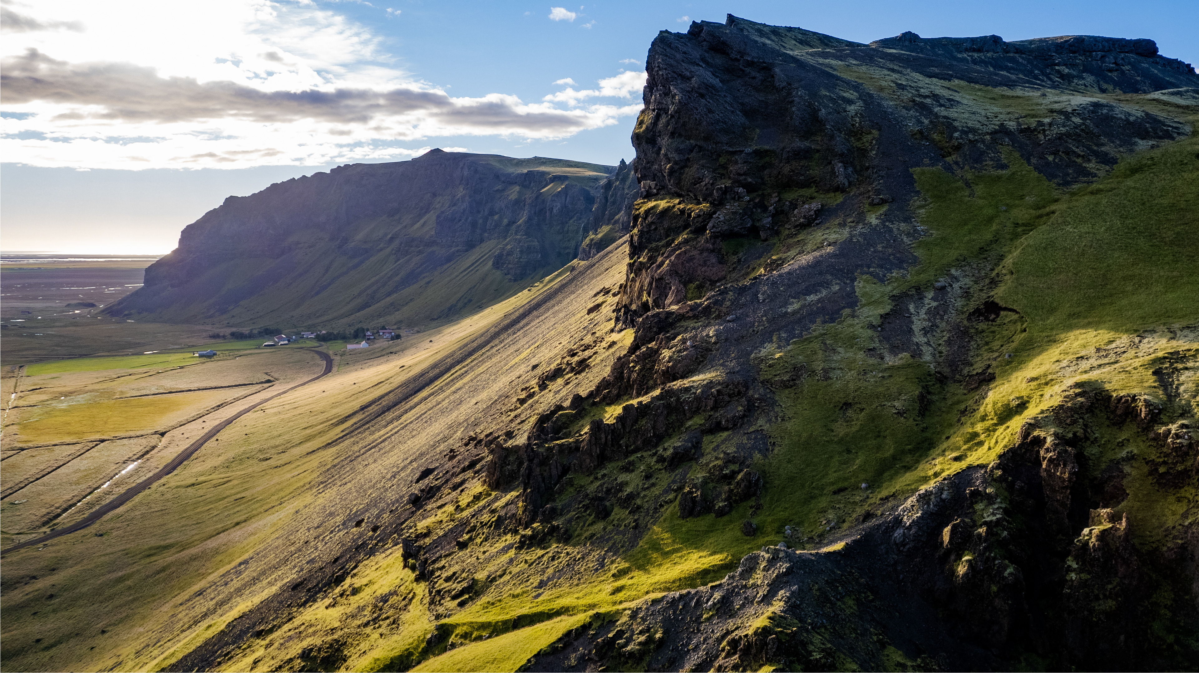 Finally, we started our descent to the west coast. Here, rugged rock formations on the cliffs awaited us, along with a wide view of the sea to the offshore smaller islands. Looking back, the Eyjafjallajökull built up on the mainland, above the roofs of the houses - imposing!