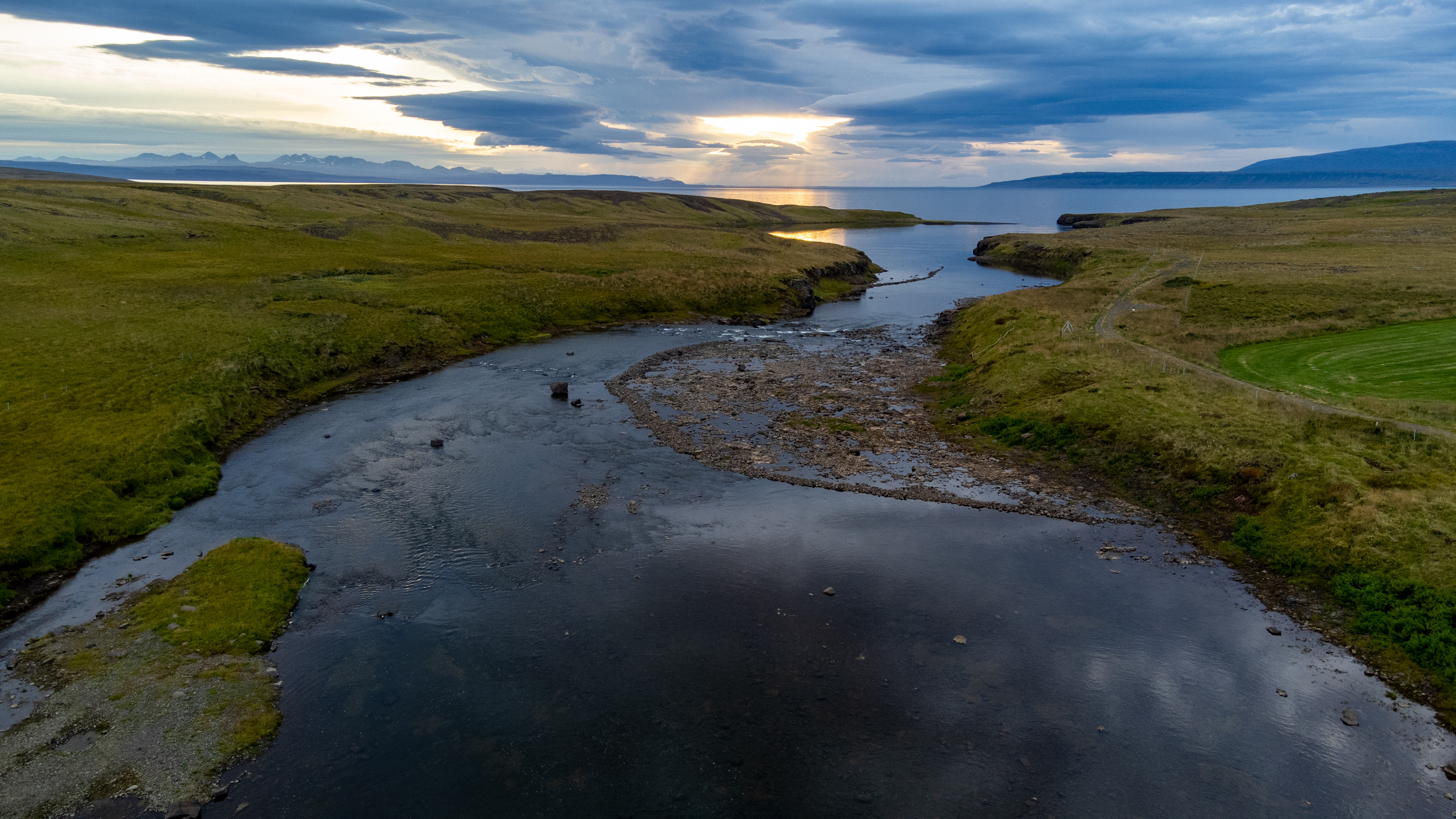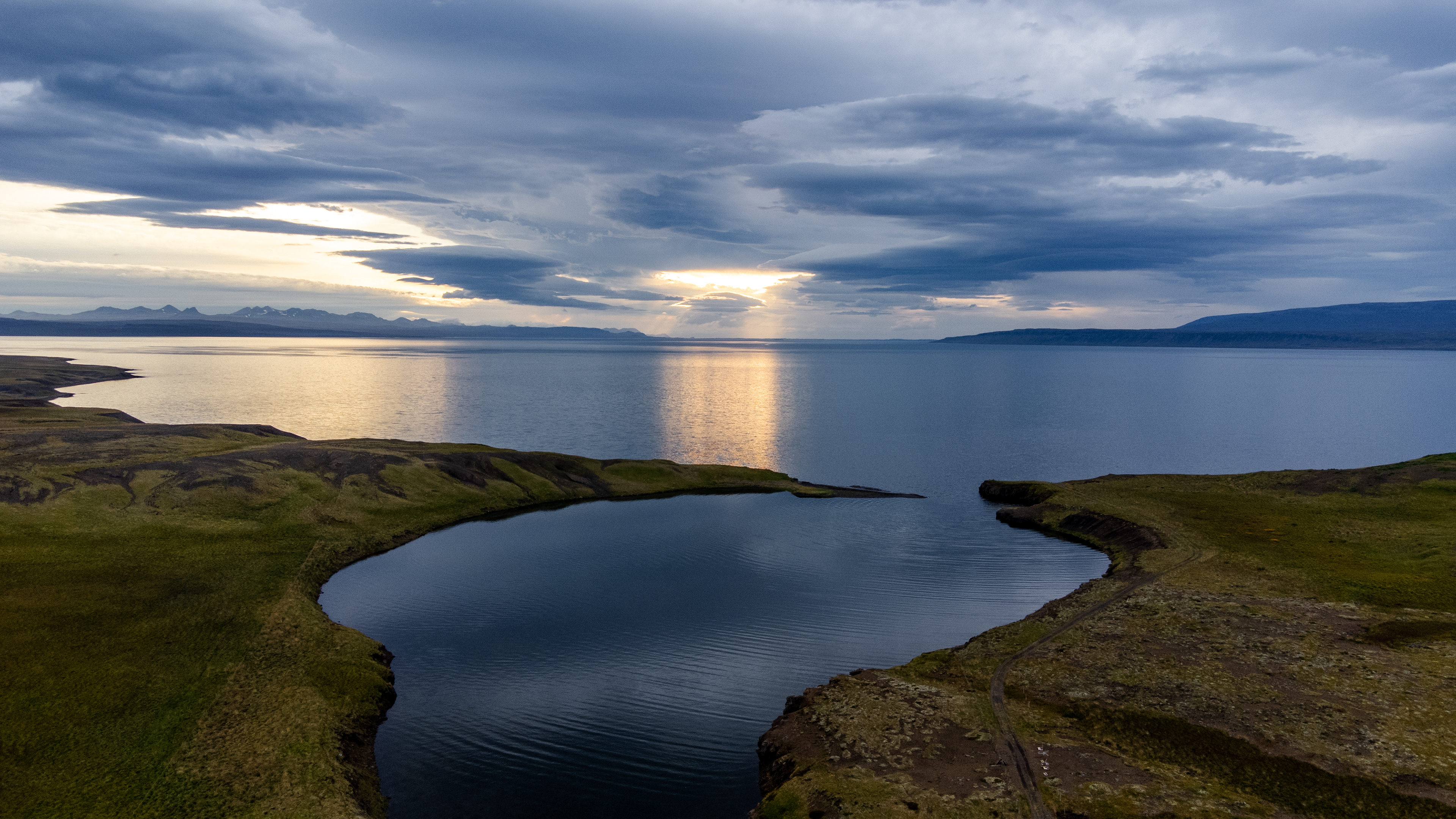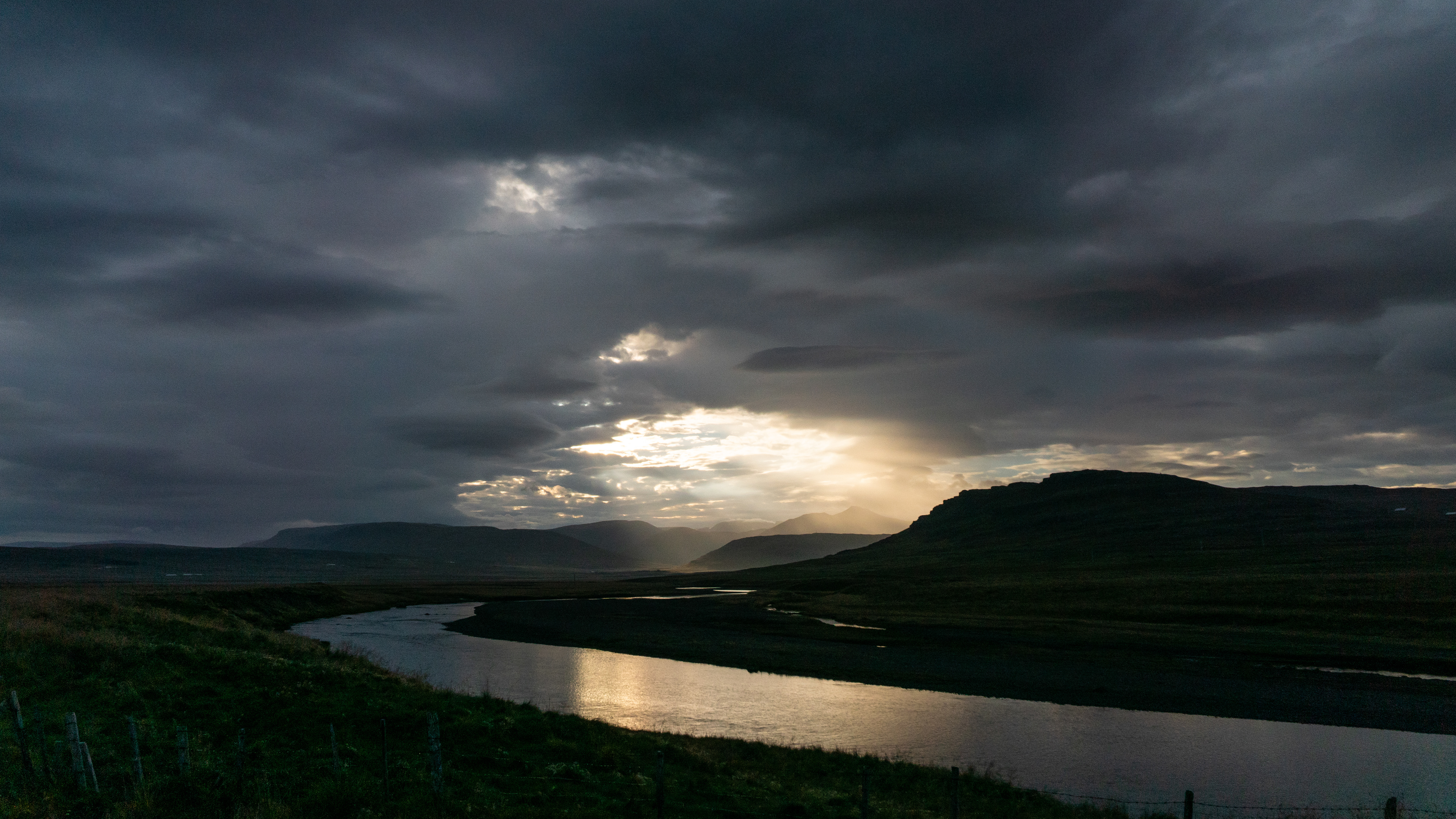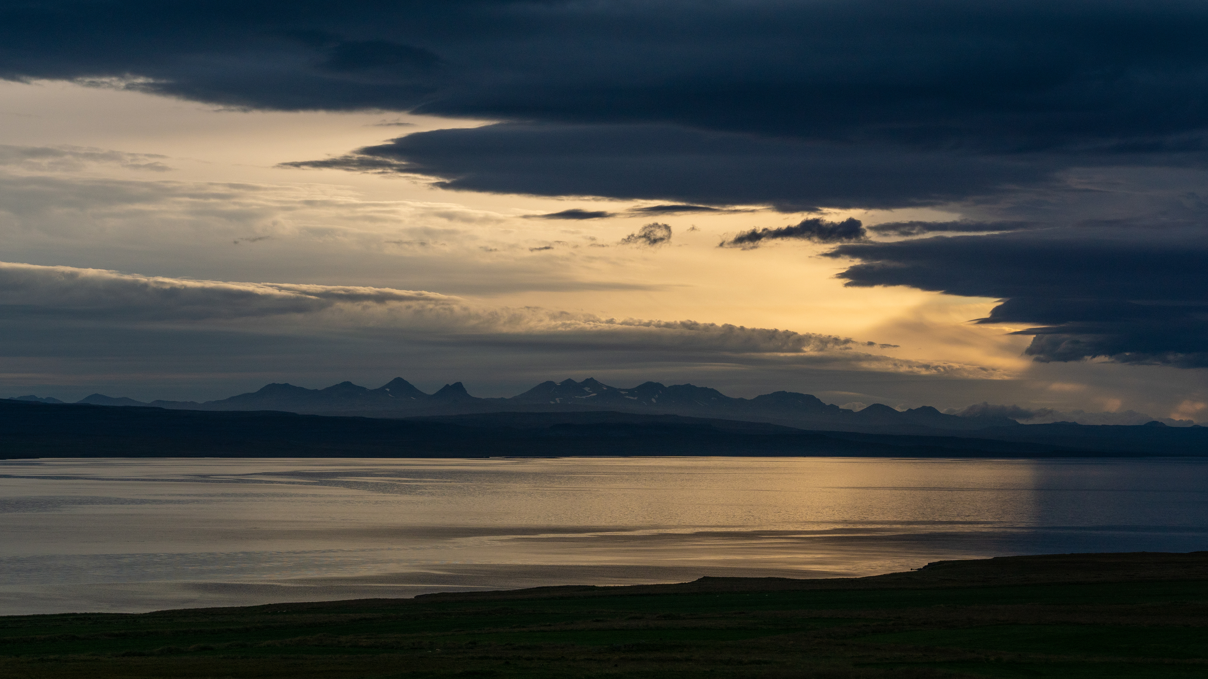 Bei einem Zufluss in den Fjord bei Búðardalur, bot sich zur blauen Stunde, dann noch ein weiter Blick aufs Meer und die Sonne.