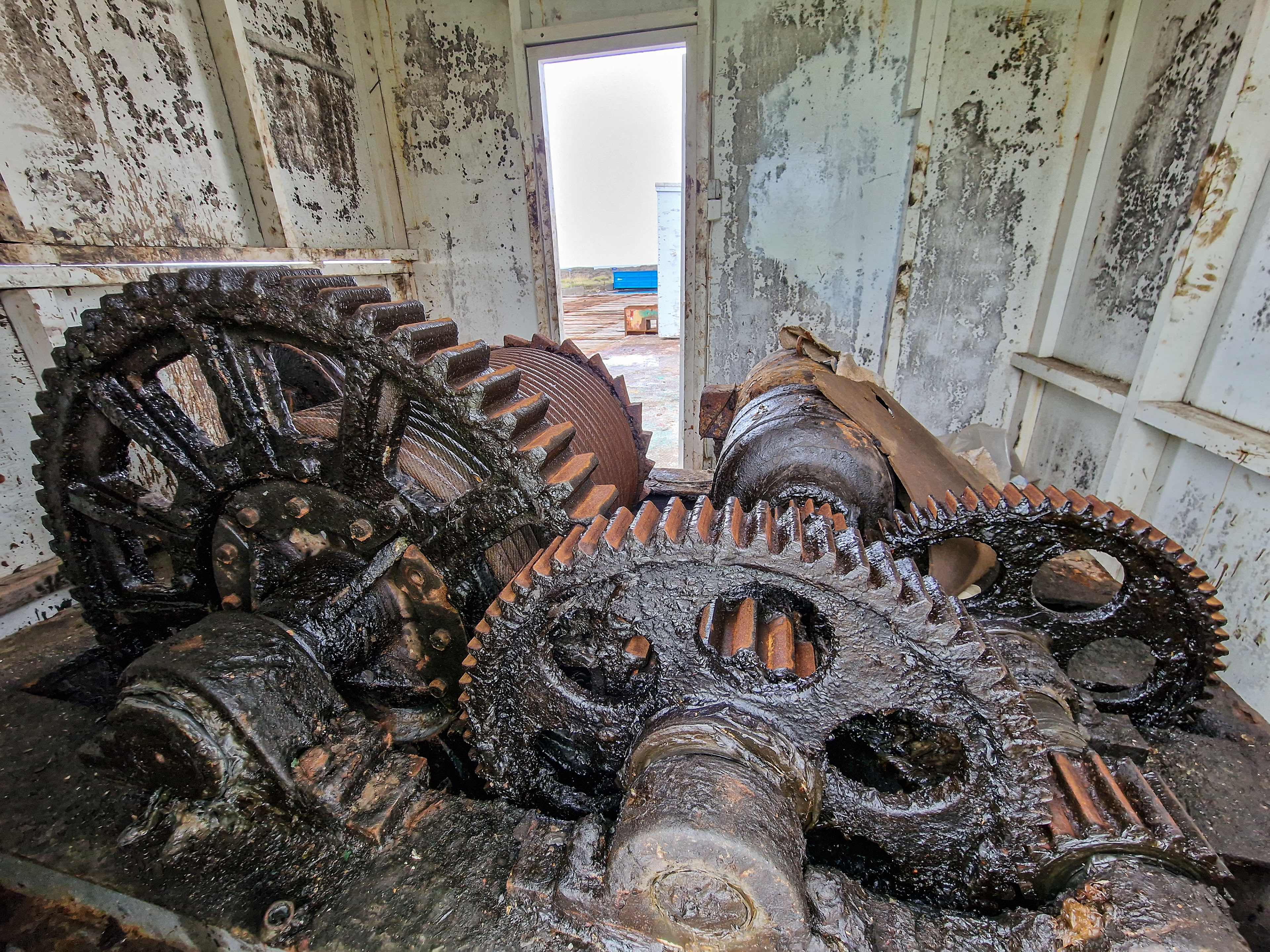 Die Holzplanken waren durch die Witterung und den fehlenden Lack so ausgebleicht, dass man die Maserung gut sehen konnte. Neben Holz war das dominierende Material Rost, keins der ursprünglich beweglichen Teile bewegten sich noch einen Millimeter.