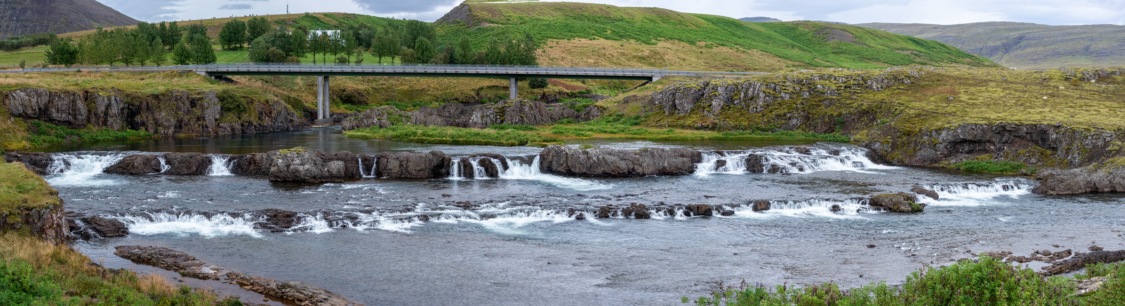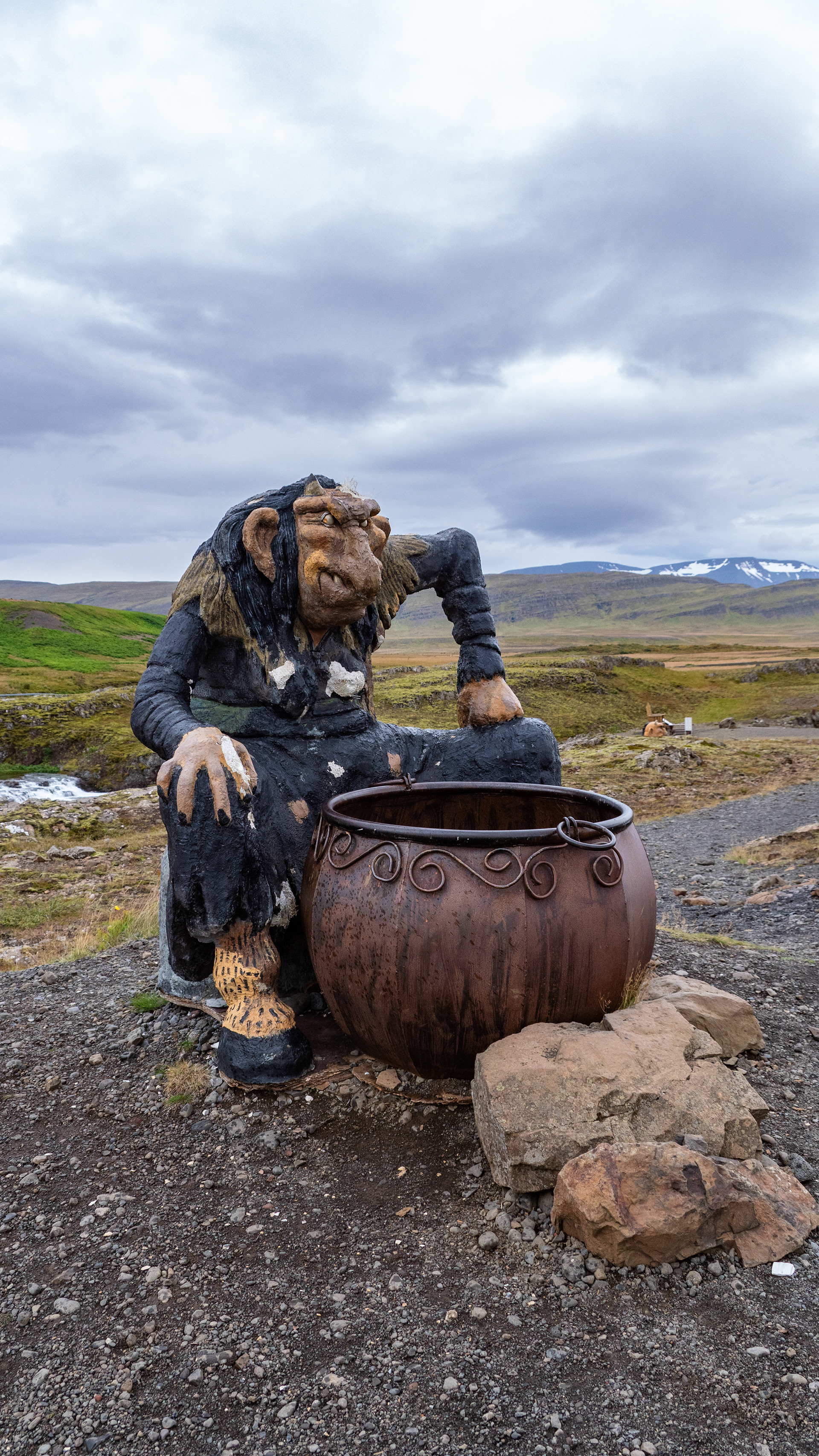 Zurück auf der 50, lag direkt an der Straße noch eine Hotelanlage mit einem witzigen Troll-Garten, passend mit einem schönen breiten Wasserfall.